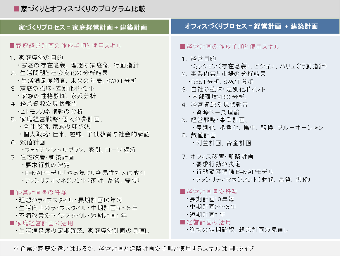 上記の表は、住宅とオフィスビルの設計手順や項目、さらに活用される経営スキルを比較したものです。消費用建物と事業用建物という違いはありますが、経営計画や建築設計のプロセスには大きな違いは見られません。